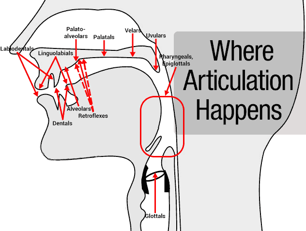 Frankly, a lot of “knowledge” about articulation isn’t necessary to start fixing things. Articulation (Wikipedia) is the movement of the tongue, lips, jaw, and other speech organs (the articulators) in ways that make speech sounds. But scroll down for diagrams about things people ask about.